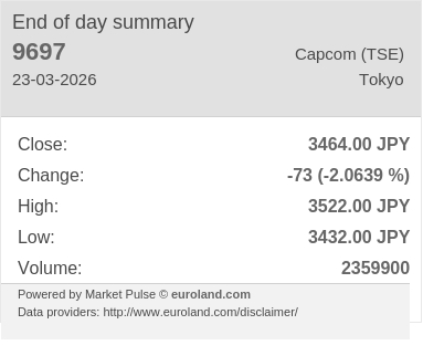 株式会社カプコン 広報IR室@CapcomIR·23 Mar[9697] カプコン(東証プライム) 本日の終値:3464.00 円 前日比:-73 円(-2.06 %) 高値: 3522 円 安値: 3432 円 出来高: 2359900 株 #CapcomIR pulse.euroland.com/i/9697/EOD-260…Traduire 日本語015858
