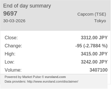 株式会社カプコン 広報IR室@CapcomIR·25 Mar[9697] カプコン(東証プライム) 本日の終値:3364.00 円 前日比:-100 円(-2.89 %) 高値: 3487 円 安値: 3364 円 出来高: 2943000 株 #CapcomIR pulse.euroland.com/i/9697/EOD-260…Traduire 日本語025564